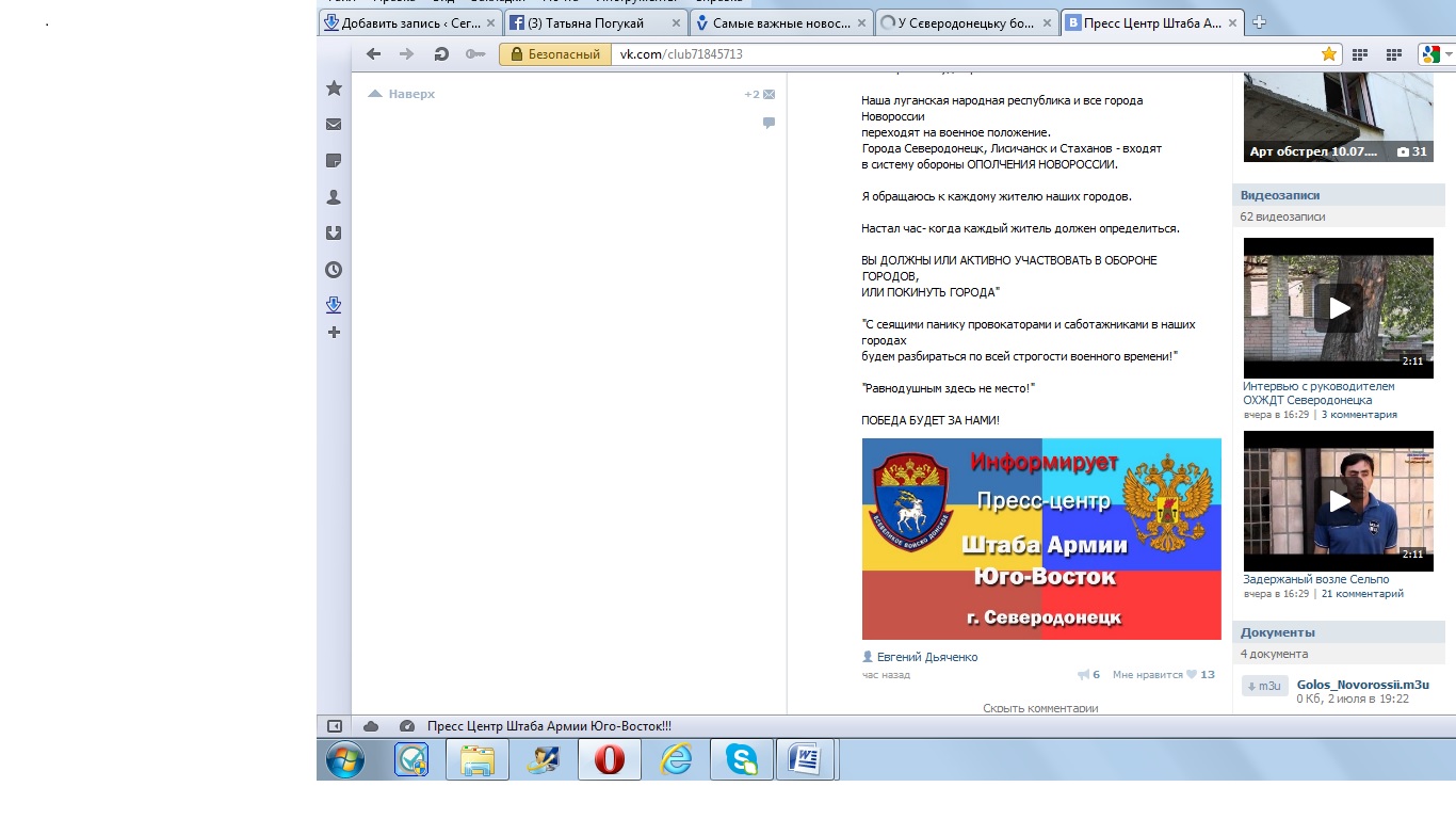 Некто Евгений Дьяченко от имени пресс-центра штаба Армии Юго-Восток обратился к жителям города с требованием либо активно участвовать в обороне либо покинуть город. И обещает, что с саботажниками (то есть теми, кто активное участие в обороне принимать не будет) они будут разбираться по законам военного времени. На картинке внизу сканированное изображение этого обращения.