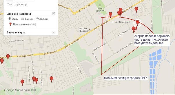 В группе "Луганск -наш город!" опубликована карта вчерашних попаданий в восточные кварталы города.