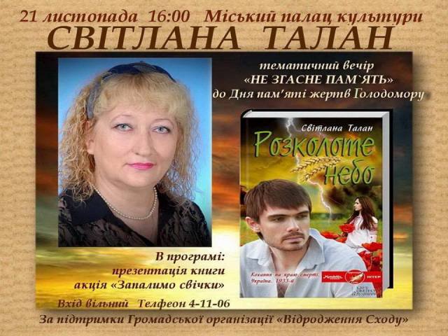 В програмі презентація книги Світлани Талан «Розколоте небо».