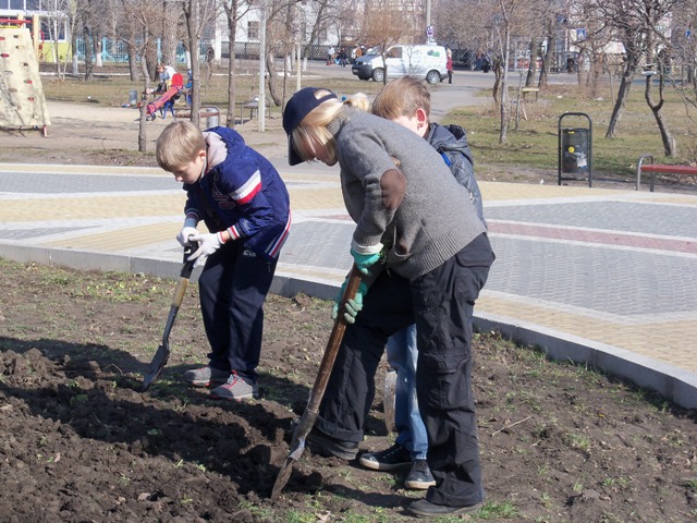 В эту субботу территорию убирали члены общественной организации "Каскад". Ребята вместе с родителями очистили территорию от листьев и мусора, вскопали клумбы.
