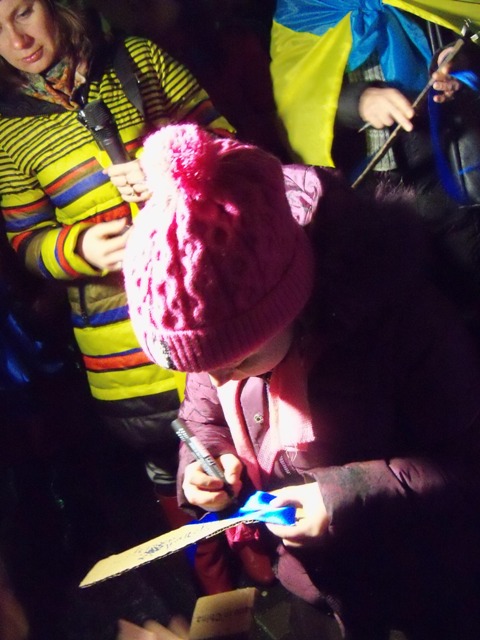 В ходе акции каждому участнику выдавалась ленточка синего или желтого цвета, на которой люди писали пожелание бойцам, украинцам, призывали политиков быть верными своей стране, желали скорейшего завершения войны, писали о единстве Украины.