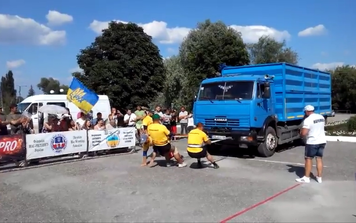 Грузовик весом 15 тонн три человека в упряжке должны перетянуть на расстоянии 20 метров. Из трех команд только луганчане смогли справиться с этим заданием.
