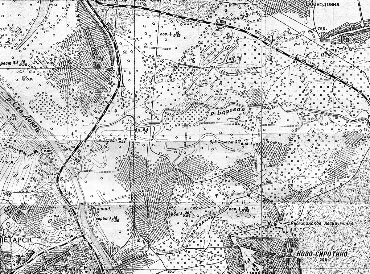 На карті 1950-х років Борова вже тече новим руслом, приблизно таким, яким ми його знаємо зараз. Але ще видно безліч проранів та відгалужень русла, які свідчать про властивість Борової “гуляти” піщаною долиною лівого берега Дінця.