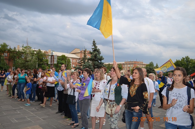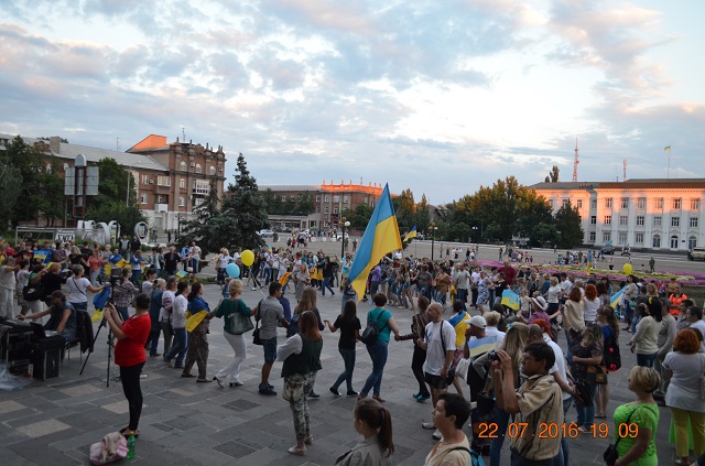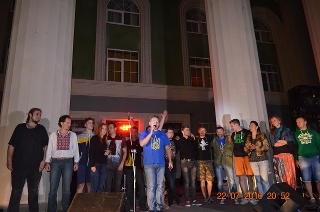 І не змогла зіпсувати настрою навіть надзвичайна темрява, яка в той день була на площі, бо міська влада не те, що не спромоглася увімкнути світло, а й вимкнула підсвітлення навіть на своїй будівлі Міськради, яка теж розташована на площі Миру і підсвічувалась завжди! Був темним чомусь цього вечора і ґанок Палацу Культури хіміків, на якому виступали артисти. Імпровізовану сцену освічували фари автобуса і камери журналістів. Але той дух, який панував на концерті, та щирість, яку несли в собі люди, не може зрівнятись ні з чим! Хіба може зіпсувати такий чудовий концерт якась темрява? Адже сила української пісні об’єднує схід і захід, північ і південь в єдину країну набагато краще і швидше, ніж будь які інші чинники! Коли зовсім стемніло, люди не розгубилися, дістали ліхтарики й телефони і це було неймовірно красиво!
