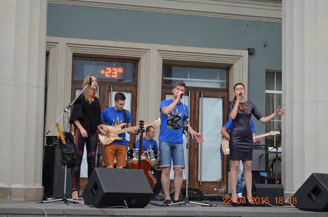 Почався концерт із запізненням на годину, о 19-й , одразу після покладання квітів, і зібрав чимало прихильників сучасної української музики. Багато людей прийшли у вишиванках, з українською символікою і прапорами, адже українська музика нікого не лишає байдужим, бо українські пісні є одними з наймелодійніших у світі! Приємний етно-рок дарував київський гурт «ТаРута», поєднання рок музики і звучання сопілки, робить їх пісні ніжними і ліричними, а деякі навіть спонукають публіку танцювати, об’єднавшись у велике коло. Справжнім зарядом позитиву стало спільне виконання публікою пісні “Червона Рута” під акомпанемент гурту “ТаРута”, а найкращим виконавцям ведучий Василь Панченко вручив призи. Приємно було почути пісні нашої землячки, сєвєродончанки Катерини Бойко, яка у складі «Музичного батальйону» завітала привітати рідне місто з другою річницею визволення. Пісенна лірика співачки не залишила нікого байдужим.