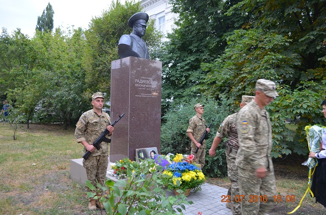 Після чого відбулося урочисте покладання квітів до пам’ятника генералу-майору Олександру Радієвському, якого два роки тому щасливі сєвєродончани зустрічали саме на цій площі Миру і дякували за визволення. А наступного дня він трагічно загинув при звільненні сусіднього Лисичанська від окупантів. Сєвєродончани навіть хотіли назвати вулицю іменем Радієвського, адже саме цій людині ми завдячуємо мирним небом у нашому місті, але місцева влада заблокувала прийняття цього рішення.