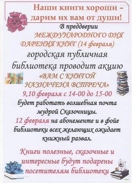 В перддверии Международного дня дарения книг (14 февраля) Северодонецкая городская публичная библиотека проводит акцию "Вам с книгой назвачена встреча".