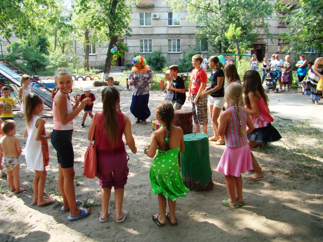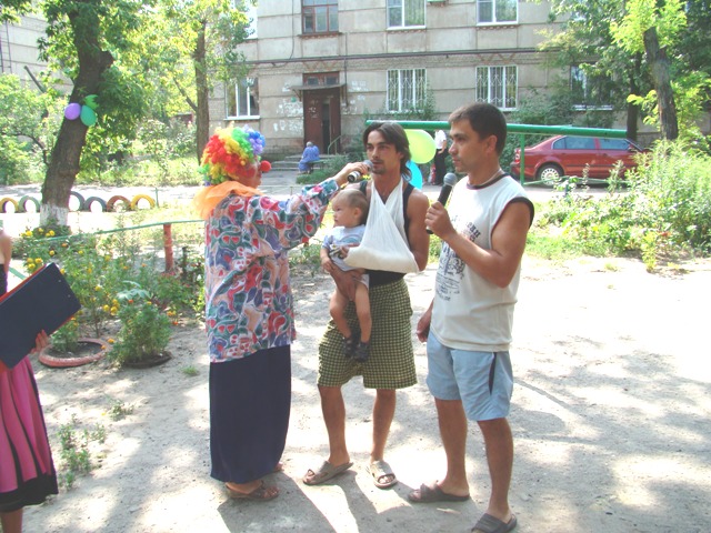 Праздник начался с развлекательной программы с обаятельным и весёлым ведущим - клоуном и его помощницей. Детская площадка на время превратилась в зрительный зал и место для выступлений, потихоньку стали собираться зрители, даже из соседних кварталов!