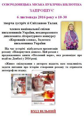 5 листопада о 10.30 в Сєвєродонецькій публічній бібліотеці відбудеться творча зустріч зі Світланою Талан, членом Національної спілки письменників України, неодноразового дипломанта літературного конкурсу "Коронація слова", Золотого письменника України.
