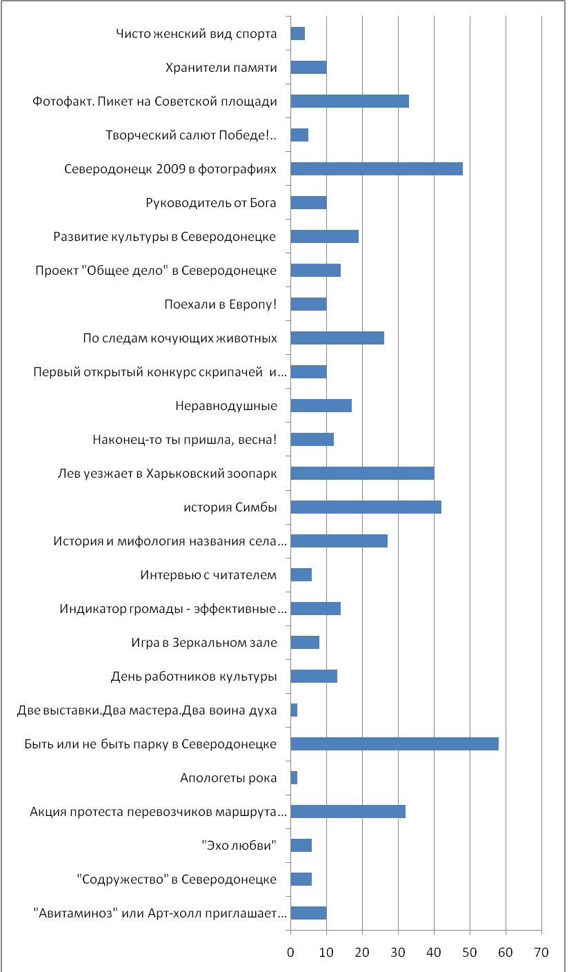 Из статей более всего запомнились читателям «Быть или не быть парку в Северодонецке» (58 голосов), «Северодонецк 2009 в фотографиях» (48 голосов), «Лев уезжает в Харьковский зоопарк» (40 голосов).