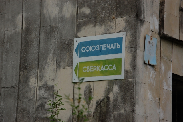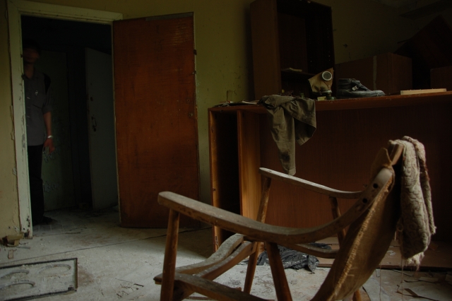 Эти желтые значки устанавливаются в местах с повышенным радиоационным фоном. Это сквер в Припяти. Это бывший магазин. В этом районе дозиметр часто пикал.