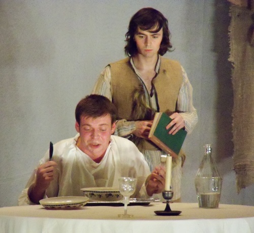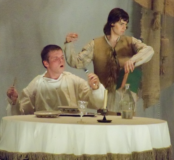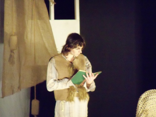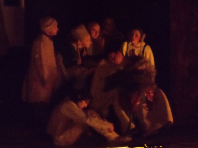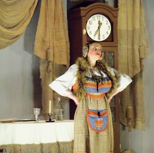Привлекает внимание оформление сцены. Напольные часы, которые актеры используют как двери, стрелки часов, которые переводят вручную – вот ОНО, остановившееся время в этом доме. Сцена в сочетании с костюмами создает ощущение живых картин.