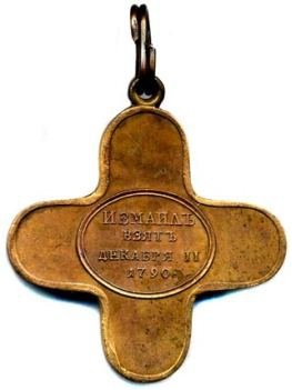 Примечание:Офицерским крестом "За храбрость при взятие Измаила" награждались офицеры, участвовавшие в штурме Измаила, проявившие храбрость, но не получившие орденов Св. Георгия и Св. Владимира. Такие кресты очень редки по причине сдачи их в Капитул орденов после смерти награжденного.