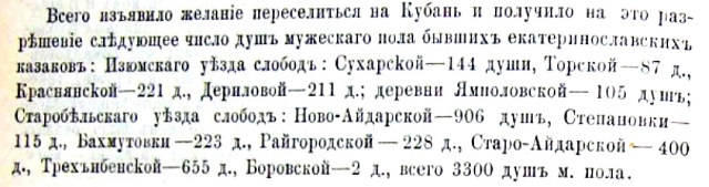 Как видно из приведенных автором данных, большинство переселенцев было из Ново-Айдарской слободы – 906 душ, далее следуют Трехибенская – 655 и Старо-Айдарская слобода – 400 душ.