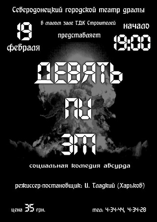 Северодонецкий городской театр драмы представляет премьеру: 1 апреля - социальная комедия абсурда «ДЕВЯТЬ ПИ ЭМ» по мотивам призведений драматургов театра абсурда.