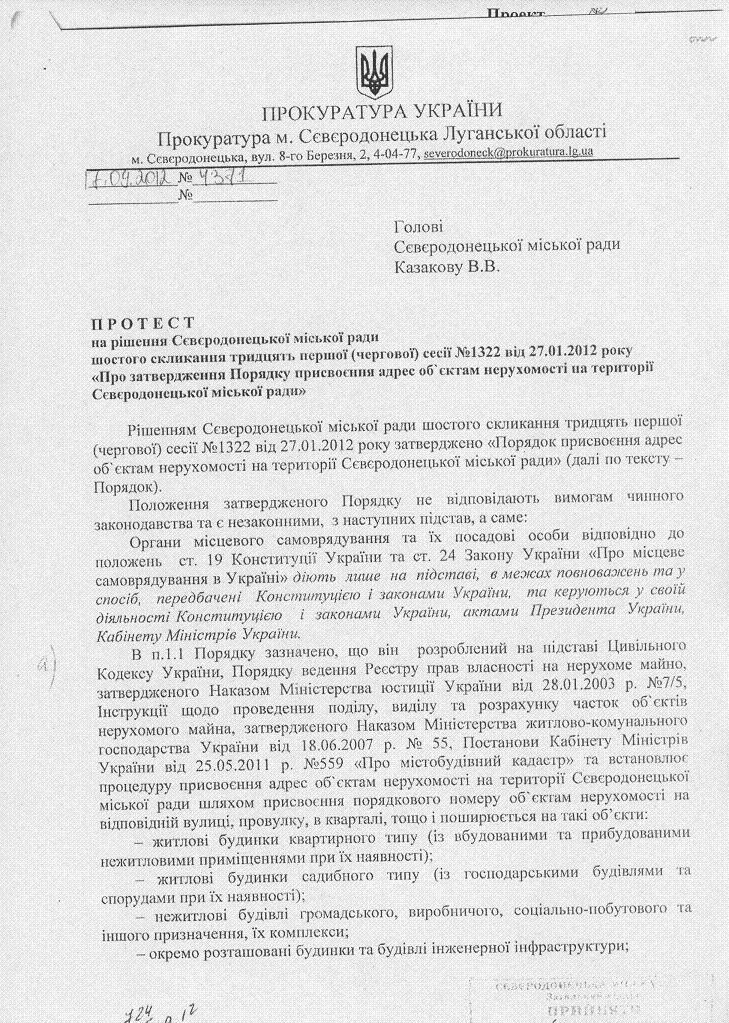 Мнение первое: решение «Об утверждение порядка присвоения адресов объектам недвижимости на территории Северодонецкого городского совета» было принято сессией северодонецкого городского совета 27 января 2012 года, а протест прокурора на него внесен 17 сентября 2012 года. То есть через девять месяцев. Уместен вопрос: почему «ребенок» вынашивался так долго? Что, прокуратура в течение столь длительного времени не усматривала нарушений, а потом вдруг «усмотрела»? Не стали ли поводом для такого «усмотрения» какие-нибудь теневые интересы? Типа подряда на выполнение работ за счет бюджета, отданного не той фирме? Или не выделенный кому-то конкретному земельный участок?