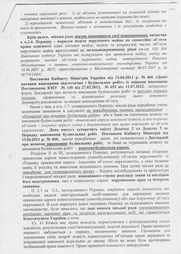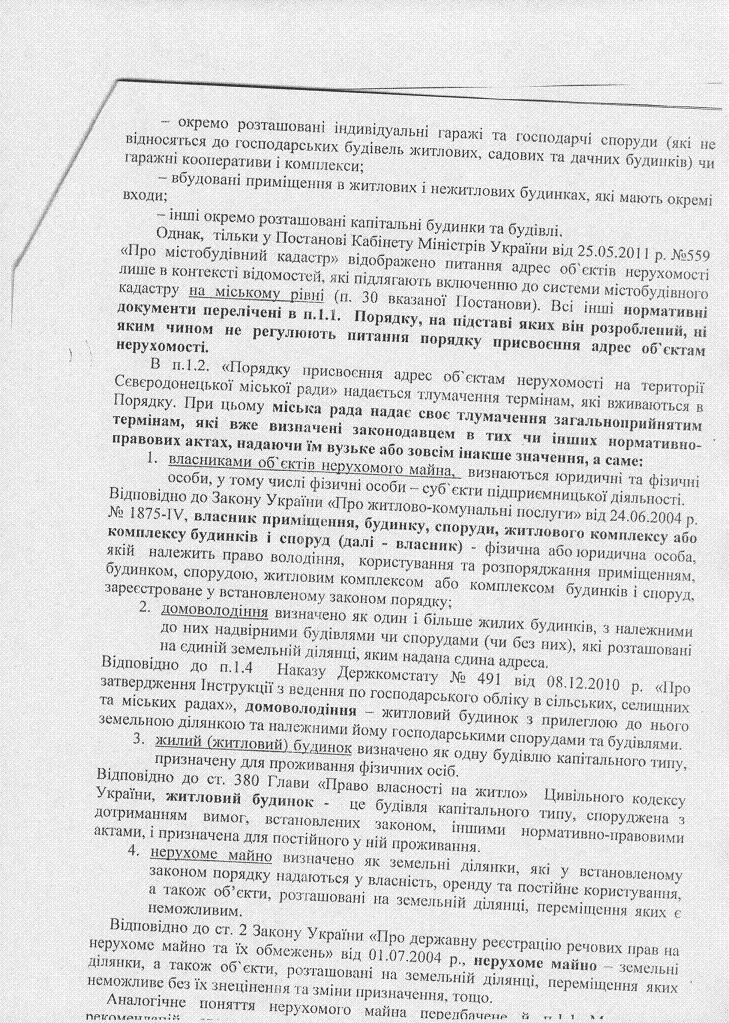Мнение второе: решение горсовета являлось местным нормативным актом, которым регулировались действия чиновников органа местного самоуправления в связи с исполнением полномочий по присвоению почтовых адресов вновь вводимым объектам недвижимости. Такое решение — далеко не первое в Украине. Например, 25 июня 2011 года аналогичное решение приняла Киевская городская государственная администрация (КГГА), и оно было весьма положительно воспринято в столице. Целый ряд других городов принял такие же. Ведь единственным общим нормативным актом, действующим в этой сфере на сегодняшний день, является принципиально устаревшее Постановление Совета Министром УССР от 1967 года. Кстати, прокурору Киева в голову не пришло обжаловать решение КГГА, обвинив последнюю в превышении компетенции. А вот Сергей Григоров сделал именно так.