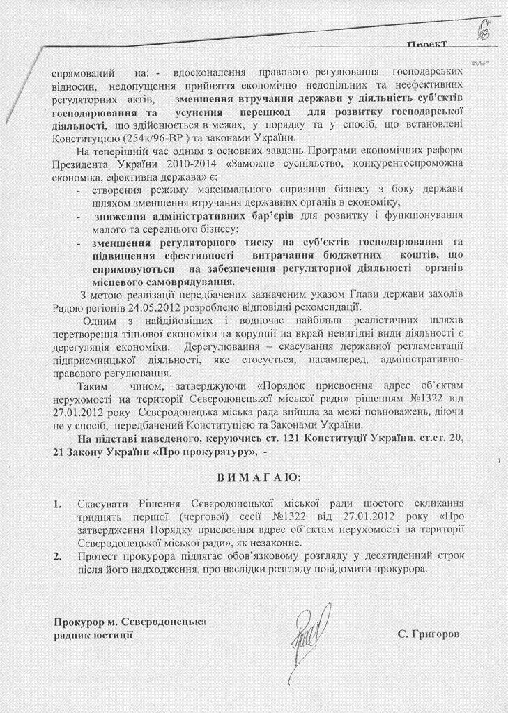 Мнение третье: не соответствуют интересам жителей Северодонецка и действия депутатов городского совета. Ведь своим решением они отменили порядок присвоения адресов, введенный 27 января 2012 года, и тут же обязали отдел архитектуры подготовить новую редакцию этого нормативного акта. И что теперь делать людям, которые им уже пользовались в течении 10 месяцев? Для нас совершенно очевидно, что если подобный местный нормативный акт нужен, и принят в рамках компетенции органа местного самоуправления, но были проблемы с обоснованностью (законностью) отдельных пунктов, то Порядок надо было не отменять, а изменять. В том числе с учетом тех замечаний прокурора, которые были обоснованными.
