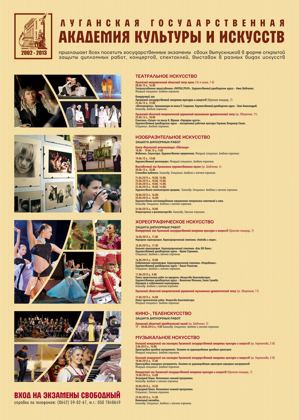 8 – 25 июня 2013 года Луганская государственная академия культуры и искусств приглашает луганчан и гостей города посетить традиционное мероприятие вуза – открытые государственные экзамены своих выпускников, проходящие в форме концертов, спектаклей и выставок.