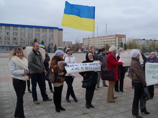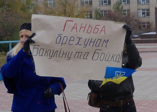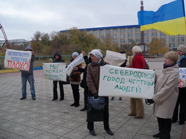На акции были плакаты «Воры на нары, а не в парламент», «Северодонецк – город честных людей», «Ганьба брехунам Бакулину та Бойко», «Вони вже вкрали – вкрадуть ще», «Покупать голоса плохо», «Ганьба Опозиційному блоку».