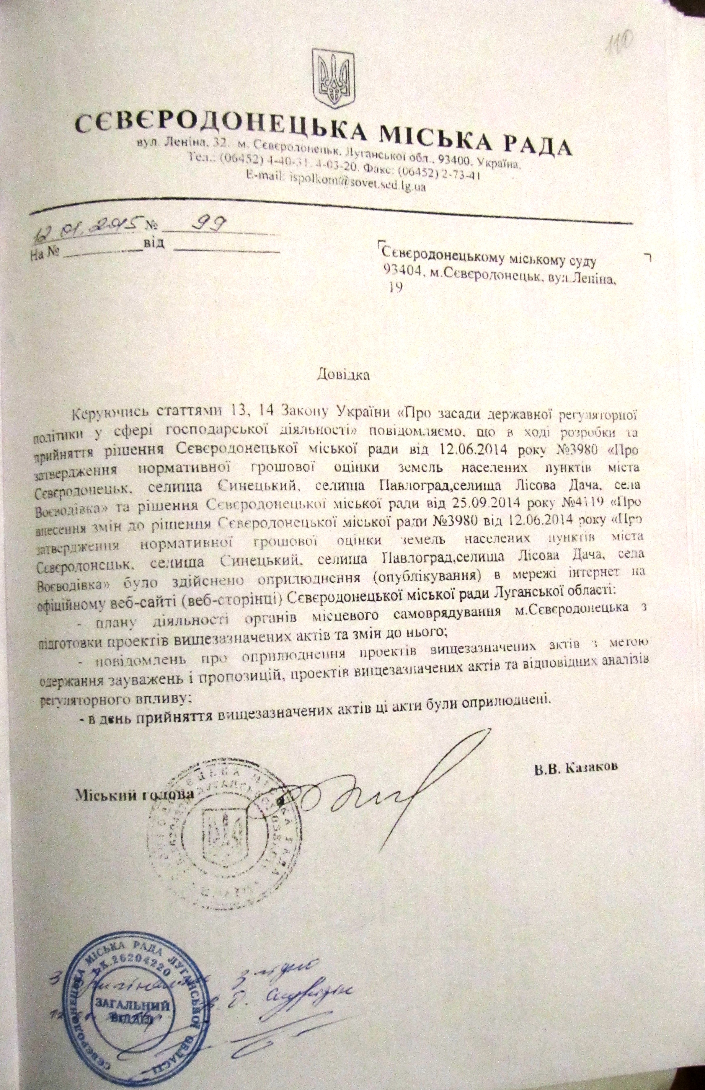 Не дивлячись на те, що Сєвєродонецька міська рада заявила (за підписом Казакова В.), що вона виконала вимоги закону, судова колегія встановила, що докази оприлюднення Рішення-4119 було сфальшовано. Так, дипломатичною мовою судового рішення (адреса в інтернеті —http://reyestr.court.gov.ua/Review/50093731):