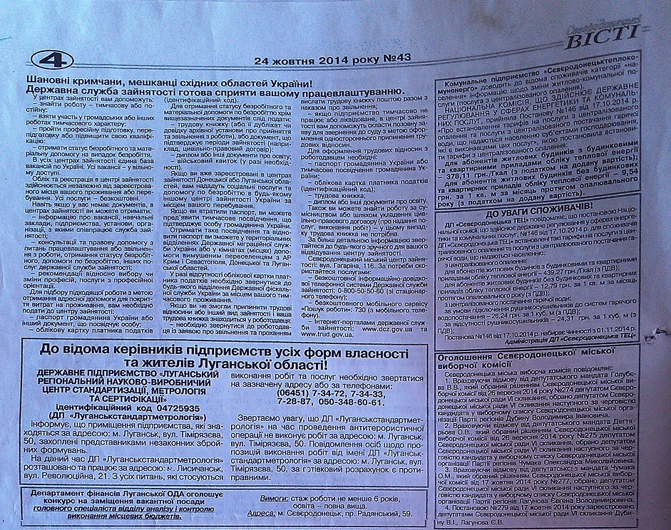 Фото 1 - Скан оригінальної газети «Сєвєродонецькі вісті» №43 від 24.10.2014р