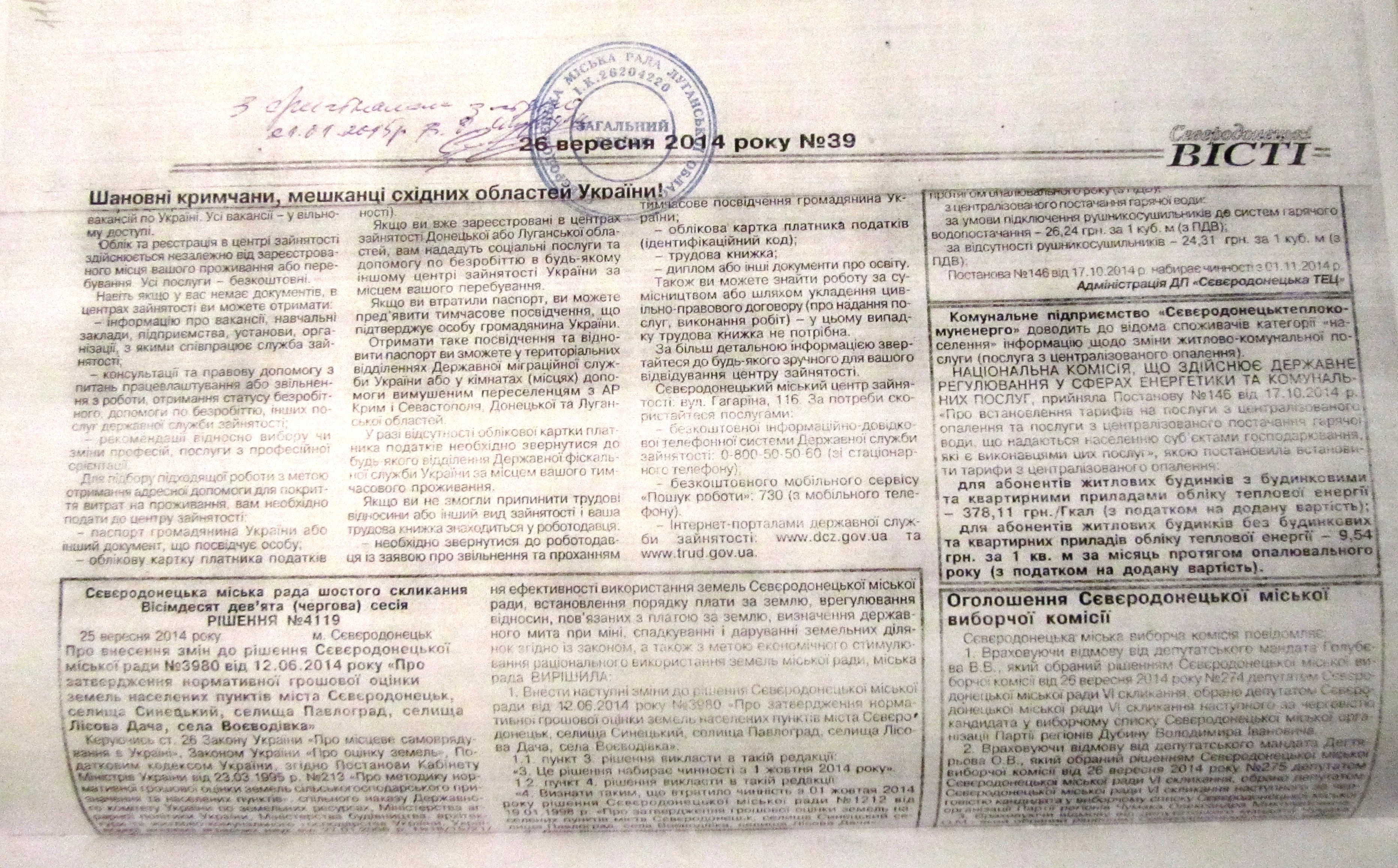 Враховуючи значимість вказаного доказу, колегія витребувала з Сєвєродонецької міської публічної бібліотеки ті ж самі номери газети «Сєвєродонецькі вісті» № 39 від 26 вересня 2014 року і № 43 від 24 жовтня 2014 року. (т. 2 а.с. 129 – 135).