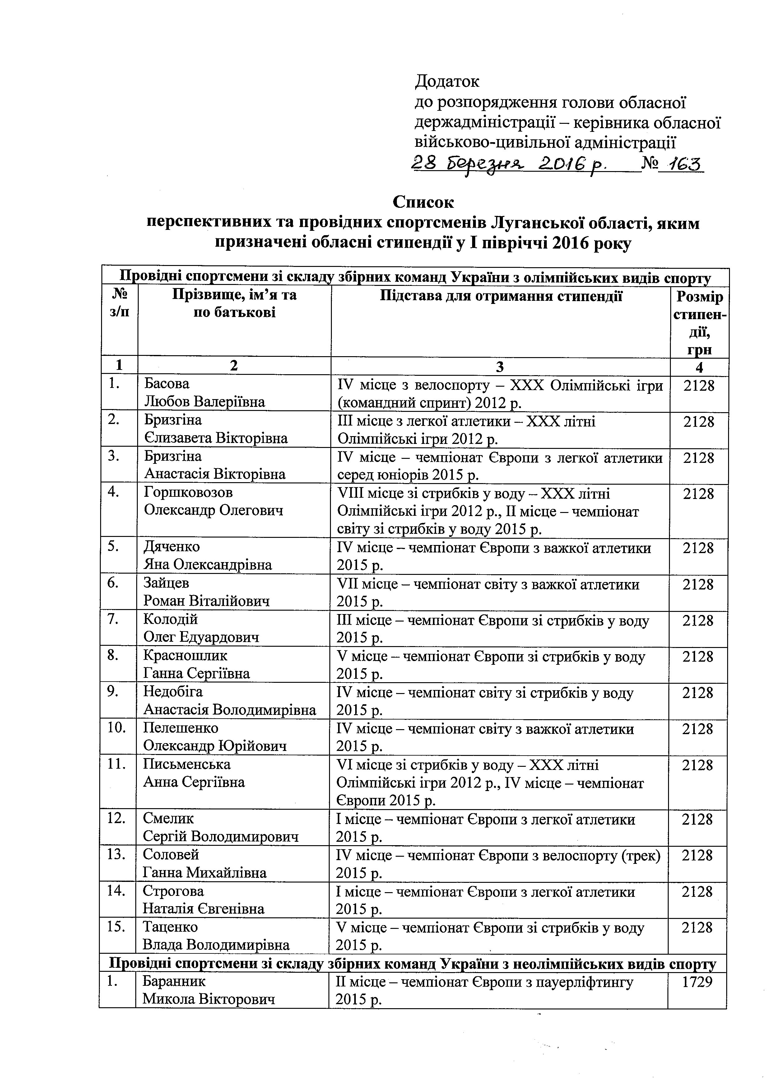 Згідно розпорядження у І півріччі 2016 року 64 перспективних та провідних спортсмени Луганської області отримуватимуть щомісячну обласну стипендію.