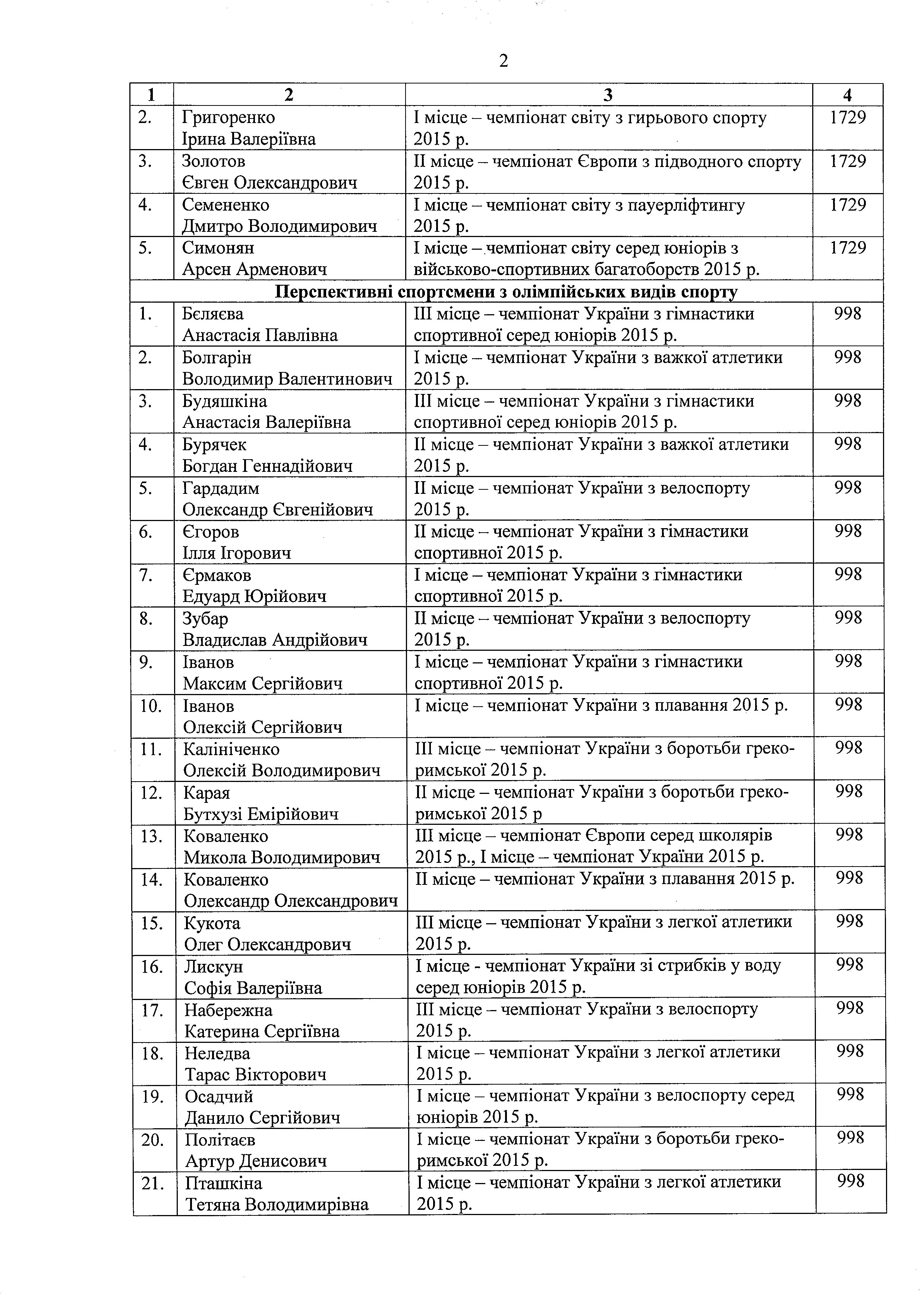 Серед стипендіатів: 15 провідних спортсменів зі складу збірних команд України з олімпійських видів спорту, 5 провідних спортсменів зі складу збірних команд України з неолімпійських видів спорту, 32 перспективних спортсмени з олімпійських видів спорту, 8 перспективних спортсменів-інвалідів та 4 провідні спортсмени-інваліди.