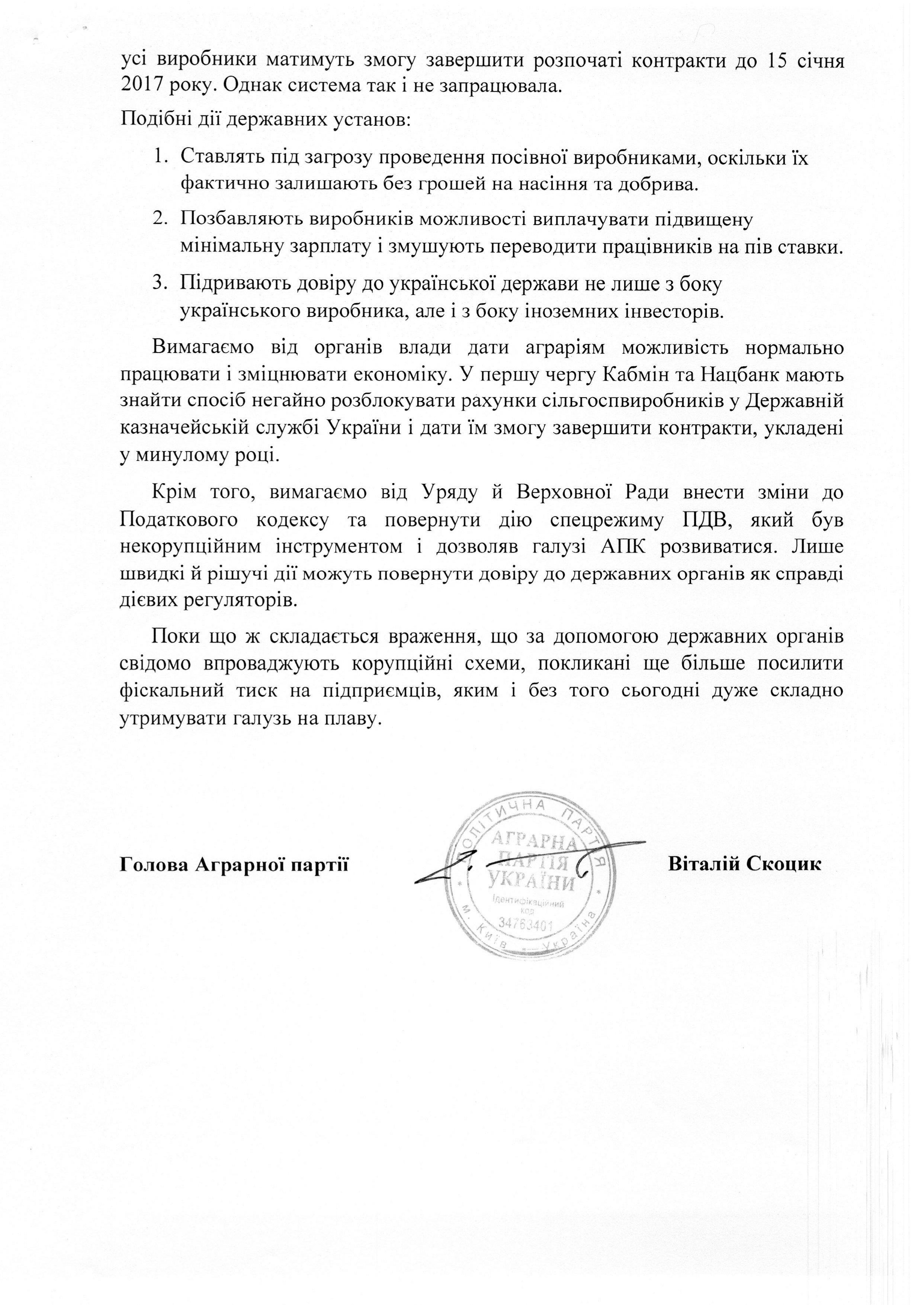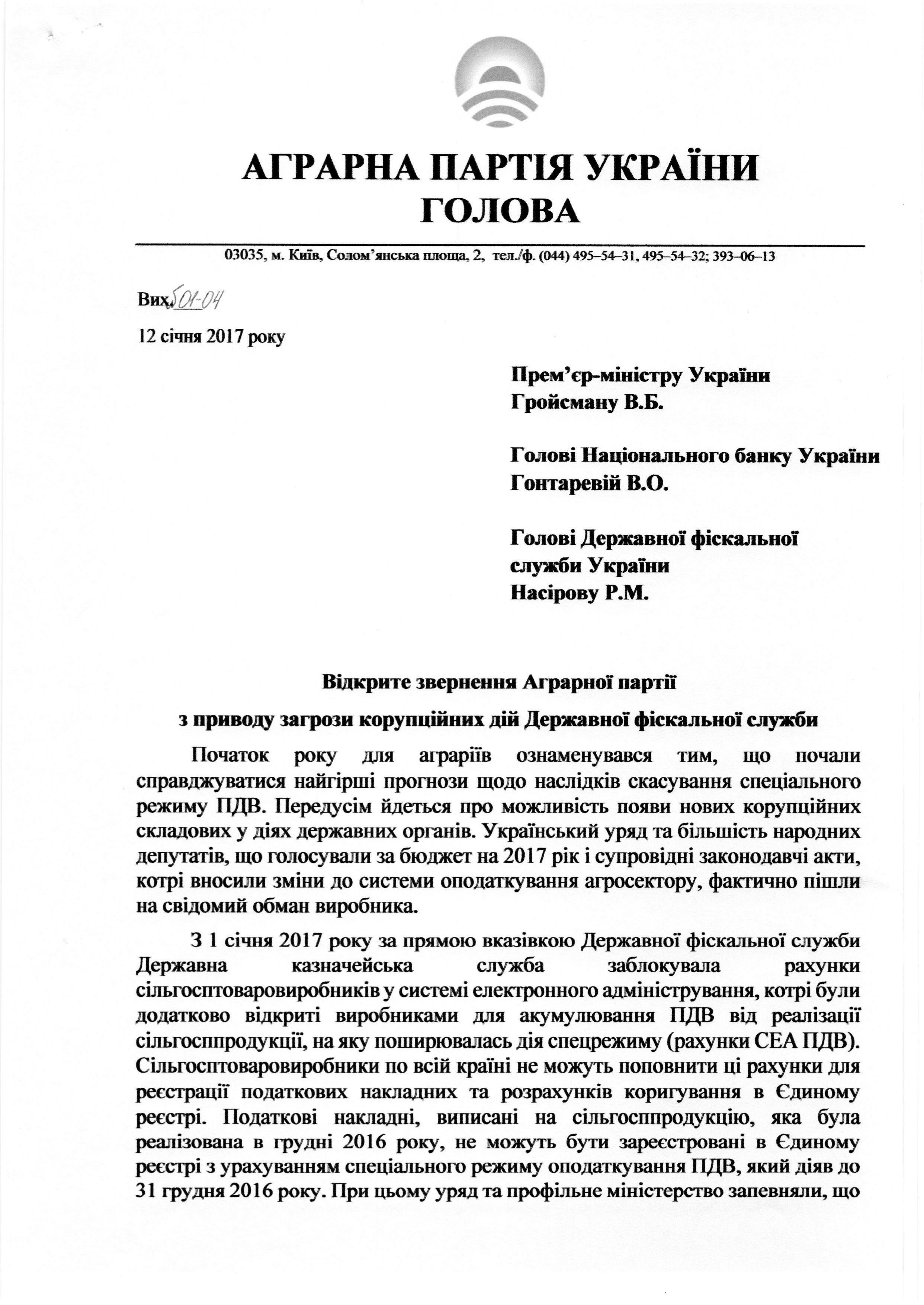 «З 1 січня 2017 року за прямою вказівкою Державної фіскальної служби Державна казначейська служба заблокувала рахунки сільгосптоваровиробників у системі електронного адміністрування, котрі були додатково відкриті виробниками для акумулювання ПДВ від реалізації сільгосппродукції, на яку поширювалась дія спецрежиму (рахунки СЕА ПДВ). Сільгосптоваровиробники по всій країні не можуть поповнити ці рахунки для реєстрації податкових накладних та розрахунків коригування в Єдиному реєстрі», - сказано у зверненні.