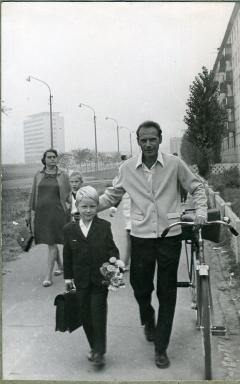 Этот снимок сделан в 1972 году. Первого сентября Иосиф Курлат ведет своего сына Вадима в первый класс. Трудно узнать по какой улице они шествуют. Город строился и только здание ГИАПа да пятиэтажки подсказывают, что по ул. Донецкой они двигаются в СШ № 4. Слегка растерянный, но улыбающийся ребенок несет в одной руке – портфель, а в другой - цветы первой учительнице. У Иосифа Борисовича тоже руки заняты – одной он обнимает сына, чтобы тот, чувствуя защиту отца, был более уверен, а другой рукой ведет велосипед. Казалось бы, такой известный в городе человек придет в школу в этот торжественный день обязательно в официальном костюме при галстуке.