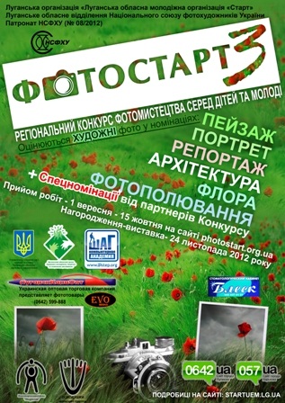 С 1 сентября по 15 октября на сайте photostart.org.ua осуществляется прием работ для участия в Региональном конкурсе фотоискусства среди детей и молодежи «Фотостарт-3». Об этом сообщает пресс-центр молодежной организации "Старт".
