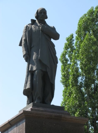 Установка этого памятника на площади, при входе в небольшой сквер, самый удачный пример создания микроансамбля в нашем городе. Созданный в масштабах, соразмерных человеку, он образует как бы участок особой, художественной, интеллектуальной среды в шумной и суетной городской обстановке. Продуманный по композиции, отточенный по форме, этот памятник принадлежит к числу лучших памятников города.