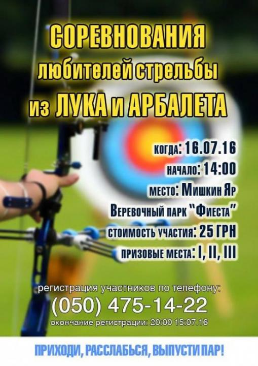 16 июля 2016 г. на территории Мишкиного Яра возле Веревочного Парка состоятся любительские соревнования по стрельбе из лука и арбалета.